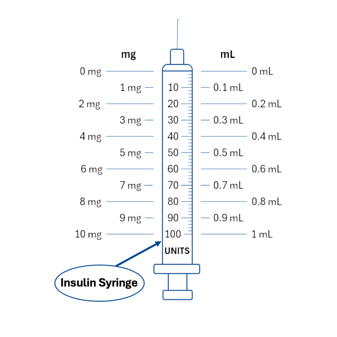 To convert mL to units: Multiply the mL by 100 (e.g., 0.5 mL = 50 units). Example: A dose of 0.5 mL equals 50 units.